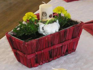 Heute sei erst der offizielle Tag des Treffens, flüsterte mir Bastia ins Ohr. Ja wie, dann war das erst das Vorgeplänkel? Also ich wäre eingedeckt mit Eindrücken, bin ganz im Stress! Gegen 10 gings plötzlich los, überall waren Kromis, Menschen, Kinder, Bobbycars, schreiende Katzen…Himmel! War ich froh, dass es nach einem langen Spaziergang aussah gegen 11 Uhr, aber stellt euch vor, die kamen alle mit! Eine richtige Wallfahrt! Mir hats sehr gefallen, ich war an der Spitze und da gings wunderbar mit den anderen Rüden. Sucre wollte der Sybille frisches Wild besorgen, das wurde gar nicht geschätzt. Die Menschen sind schon komisch… Zurück im Saal wollte ich so gerne die schöne Tischdeko bewundern…