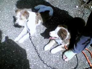 halt ein Handybild, aber immerhin! ich war ja schon seeehr gespannt und habe mir da was ganz anderes darunter vorgestellt... ich war auf einen lauten und lärmigen Welpen eingestellt, denn Frauchen sprach immer davon, dass der scheppert...davon konnte ich nichts bemerken, aber ich habe mitgekriegt, dass er aus Australien kommt, muss weit weg sein... also das muss ich nochmal überdenken... aber ist eh wurst, Linus ist klasse und wir haben uns sofort sehr gut verstanden und haben rumgetobt wie die Wilden! Gina hat manchmal auch mitgemacht, dann wars ganz lustig! und am Schluss waren wir nudelfertig, der kleine Linus sowieso! ich habe dann daheim ein kurzes Mini-Schläfchen gemacht, bevor ich mit Herrchen nochmal los bin, Männerrunde! juhui!