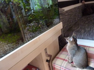 Ich armer Hund habe leider kein Aquarium hier, nicht mal in unserem Teich schwimmen Fische... was tun? zur Beruhigung empfiehlt sich auch eine Schreitherapie... und weil ich ja so rücksichtsvoll bin und nicht so lärmen möchte, nehme ich jeweils einen Apfel zu Hilfe, das dämpft den Schall...