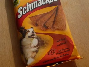 Habe ihr noch gesagt, sie solle mir den Pit grüssen, das hat sie fast vergessen! Aber sie hat mir was mitgebracht, die liebe Wurzel; das Ostergeschenklein vom Pit für uns zwei oberbraven Hunde!