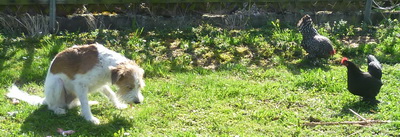Es kaut sich sehr schlecht auf einem leckeren Hühnerhals, wenn daneben zwei von unseren eigenen Hühner stehen und mich strafend anschauen...