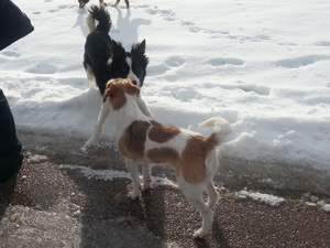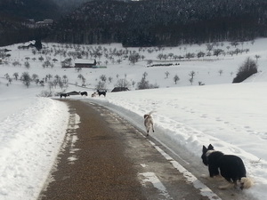 Heute kann man aber endlich wieder laufen und wir haben Glück, wir treffen gleich anfangs Spaziergang Kathrin mit ihrem Fünfer-Rudel mit den komischen Hunden. 4 Damen und eine kleiner Herr.
