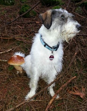 Während Wurzel nach Mäusen sucht und sich dabei total einsaut (wie peinlich), erhalte ich ein Bild von Wolke. Sie zeigt, wie man das richtig macht... schön sauber bleiben und zielgerichtet suchen... Sie hat einen Steinpilz gefunden, da würde sich mein Frauchen auch darüber freuen....