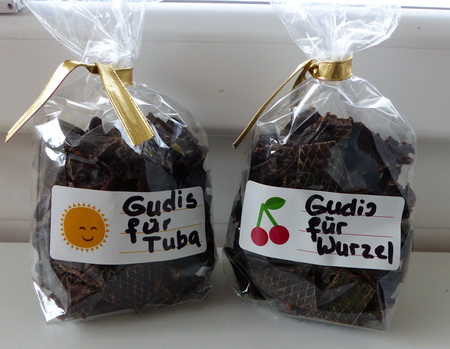 Deswegen freue ich mich ganz speziell über die beiden Säcklein. Eines für Wurzel, eines für mich. Mit Liebe gemacht und ich bedanke mich ganz herzlich. Auch im Namen von Wutz. Die hat grad den Mund voll und kann nicht selber sprechen.