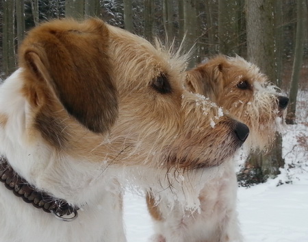 Wir liefen am Waldrand, ich 5 m vor Frauchen, Wurzel 30 m voraus, sie rannte glückseelig über den verschneiten Acker. Da rennt plötzlich ein Reh aus dem Wald an Wurzel vorbei, bergwärts. Wurzel fand das natürlich lustig und rannte dem hinterher, vielleicht gibt's ja was umsonst...