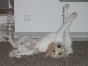 so, ich wollte ja noch von meinem Besuch bei dem komischen Onkel Doktor erzählen... das war ja ein Ding...also, wir mussten ein wenig warten, weil da ein Notfall war. so ein armer Kerl kam auf drei Beinen in die Praxis, hat sich beim Toben auf der Wiese verletzt...derweil kriegten meine Leute einen Kaffee serviert, das ist ihnen auch noch nie passiert beim Tierarzt... dann durften wir dann rein, da lag so eine wunderschöne flauschige Decke am Boden, da habe ich mich hingelegt, gab ja keinen Grund für Panik. Die haben erst geredet, auch ganz intime Sachen über mich, oGottoGott! und dann musste ich auf den Tisch und dieser Onkel Doktor hat mich dann untersucht. d.h. ich fühlte mich wie so eine Kugel Knete, die man hin- und her walzt, und dann hat er meine Hinterbeine genommen und hat geturnt mit mir... ich war so erstaunt, ich dachte, na gut, scheint lustig zu sein, machen wir halt mal mit. aber dann ist er an die Stelle gekommen, wo's mir weh tut, d.h. es sind ja eigentlich zwei und da habe ich dann mal so ein wenig geknurrt. wollte ihn ja nicht erschrecken, aber melden wollte ich es doch...habe ihn dafür dann gleich abgeküsst, dann war wieder gut... dann durften wir noch schaulaufen, Frauchen und ich. wir wurden gefilmt dabei, ich habe meine Heldenbrust rausgestreckt und habe mein Bestes gegeben... und dann mussten wir in einen anderen Raum, das sah aus wie in Raumschiff Enterprise...so ein ganz komischer grosser Apparat und dann durften sich Herrchen und Frauchen noch verkleiden, die trugen plötzlich so lange braune Schürzen...sah echt besch... aus, entschuldigung, aber ich hätte gelacht, wenn ich gekonnt hätte. aber die freundliche Frau, die dem Onkel Doktor hilft, hatte mich schon im Arm und dann hat die mich mit einem gezielten Judogriff auf den Tisch gelegt...war schwer beeindruckt. dann musste ich liegenbleiben (hätten sie doch auch einfach sagen können, ich lege mich ja hin!) und dann machte der Onkel Doktor zwei Bilder und dann nochmal eins im Stehen. ohne Judogriff. aber Photoapparat sah ich keinen. nirgends... und dann wieder in den gemütlichen Raum, Goodies gabs auch, ich habe die auch anstandshalber gefressen, man ist ja gut erzogen... erschrocken bin ich nur, als der plötzlich so eine ganze lange Reihe Knochen neben mich auf den Tisch legt. Er hat dann mit diesem komischen Teil erklärt, wo's mir weh tut. ich hätts besser nicht sagen können, er hatte total recht. und dann? ja dann hat er nochmal geturnt mit mir, aber irgendwie anders, geknackt hats, fand ich und dann wars richtig angenehm. wusste gar nicht, dass ich solche Verrenkungen machen kann... jetzt bin ich gespannt auf den Donnerstag, dann ist wieder Turnstunde. weiss nur noch nicht, welches Gymnastikdress ich anziehen soll... hier noch ein Solidaritätsbild von meinem Bruder Twister, der ist auch gut im Turnen und im Beinegrätschen! Danke Bruderherz!