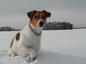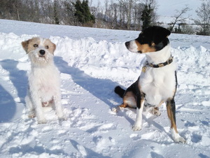 Ich werfe ihm noch einen scheuen Blick zu, er mir auch und nachher dürfen wir dann wieder abdüsen! Posieren ist langweilig, durch den Schnee rennen ist viel lustiger!