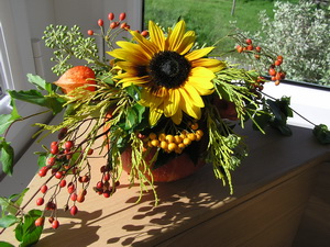 Der grosse Zwerg bringt noch ein Tischgesteck von der Feier mit heim, das erinnert uns noch ein wenig an den schönen Sonntag...