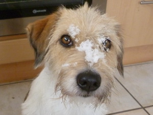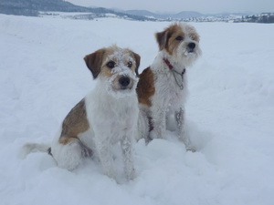 Hier hats derzeit Massen an Schnee. Alleine gestern fielen 20 cm Neuschnee und im Wald reicht mir die weisse Pracht teilweise wirklich bis an den Hals... Lustig ist das ja schon, aber halt auch kalt. Gestern waren wir mit Herrchen 2 Stunden unterwegs und haben dann noch Kathrin mit ihren fünf komischen schwarz-weissen Tieren angetroffen. Das sind genauso keine Hunde wie Wurzel und ich...So stapften wir dann zu siebt durch den Wald, hat Spass gemacht! Witzig finde ich, dass sich alle freuen, dass bei Titus die Ohren endlich stehen, bei uns müssen die hängen...ich sag's ja, alles komisch...