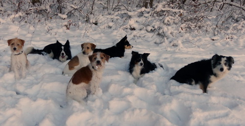 Wir treffen dann noch unsere Border Collie Freunde an, das Gruppenbild muss schnell gehen, wir kriegen kalte Bäuche! Das stinkt uns drei Kromis, den anderen viern ist das wurst... komisch...