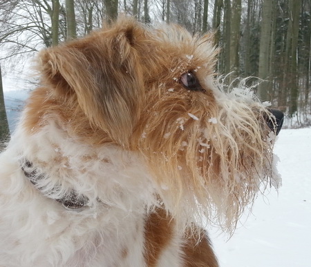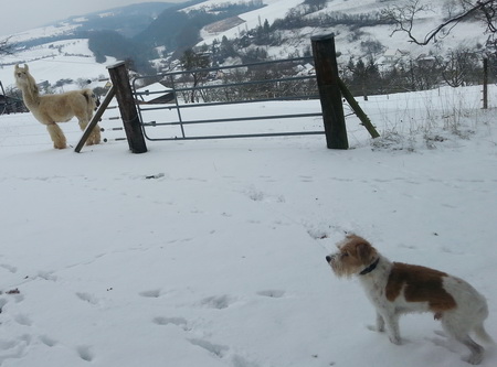 Heute Sonntag ist aber das Wetter besser, 1° plus ist sehr angenehm und so waren wir heute im verschneiten Wald unterwegs, herrlich. So mag ich das. Da kein kalter Wind weht, blieben die Mäntelchen am Haken. Auch meine Kollegen die Lamas, tragen heute nur die Winterfrisur.